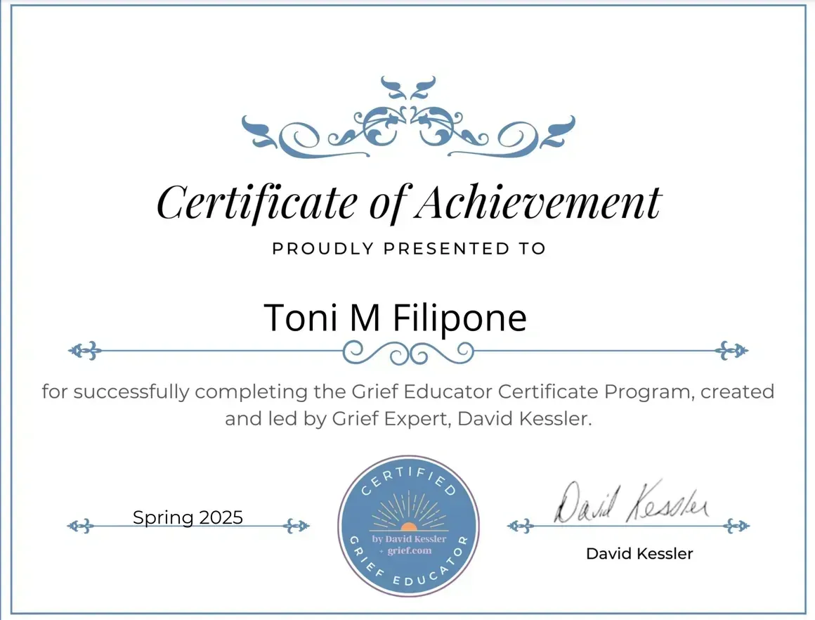 Beyond certification, MasterGrief™ offers live and online learning, including the Grief Mastery course for early grief and the online course for the First 2 Years of Grief, which provides gentle structure and practical guidance through the early seasons after loss; free MasterHearts support groups; speaking; books; and community resources that meet people where they are and move them forward with compassion and structure.